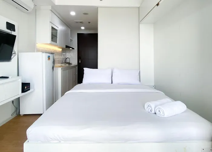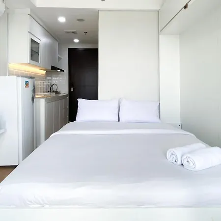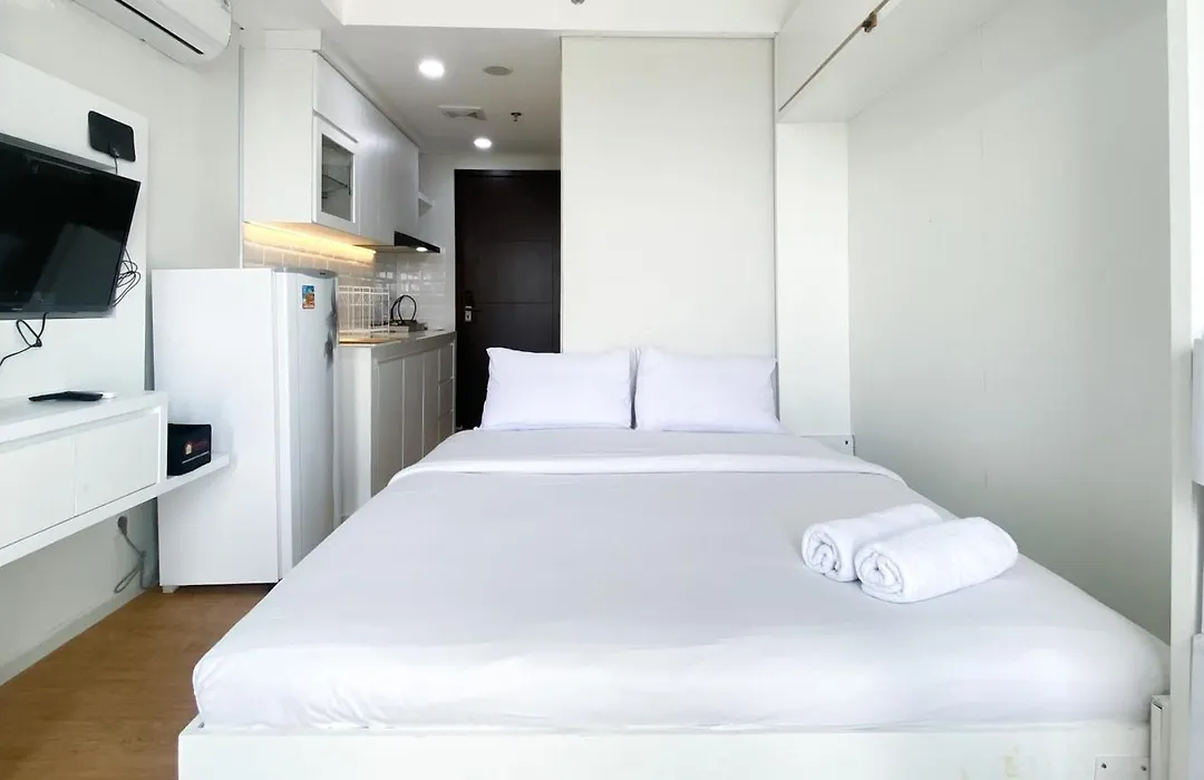 New And Modern Studio At Daan Mogot City Apartment By Travelio includes a kitchen featuring a refrigerator and a stove top. Soekarno-Hatta International airport is located 5 km away, while Halte Pesakih bus station is in the vicinity of New And Modern Studio At Daan Mogot City Apartment By Travelio.